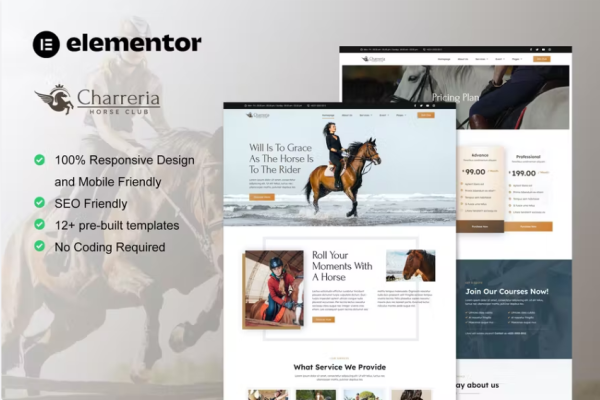 Charreria 是马俱乐部网站的 Elementor 模板套件。该模板套件还适用于创建任何与马俱乐部相关的网站,如马俱乐部官方、骑马社区、马厩、养马、马训练、户外活动、运动俱乐部等。它有 12+ 预建模板,设计简洁和现代风格。