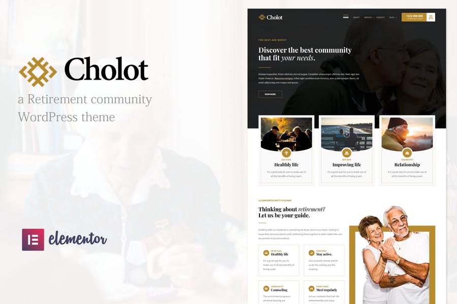 Cholot是响应式退休社区WordPress主题,具有简洁,醒目的,现代和优雅的设计。它可以用于社区或公司出售其服务。它带有拖放页面生成器,以最简单的方式创建页面/网站。