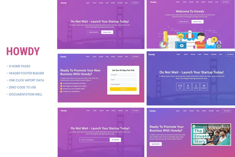 Howdy –多功能高转换目标网页WordPress主题是一个干净,现代的高转换目标网页模板,可以很容易地根据您的需要进行自定义。此着陆页模板可用于宣传Web应用程序,移动应用程序以及所有类型的营销和启动网站。快速简便的设置。\