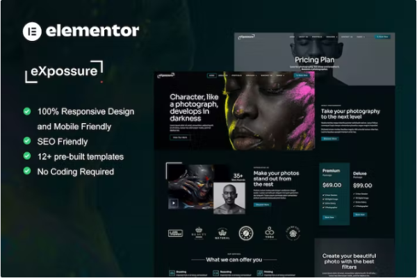 Expossure 是用于摄影和作品集网站的 elementor 模板套件。它有 12 个预建模板,具有深色风格、酷炫和创意设计。您还可以将此模板套件用于与摄影相关的任何类型的业务或服务,例如艺术画廊、在线作品集、摄影网站、艺术收藏品、数字艺术作品集等