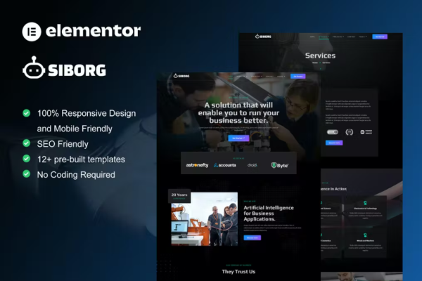 Siborg 是用于机器人网站的 Elementor 模板工具包。该模板工具包将帮助您创建任何与机器人和技术服务相关的网站。它有 12 多个预建模板,设计简洁,风格现代。