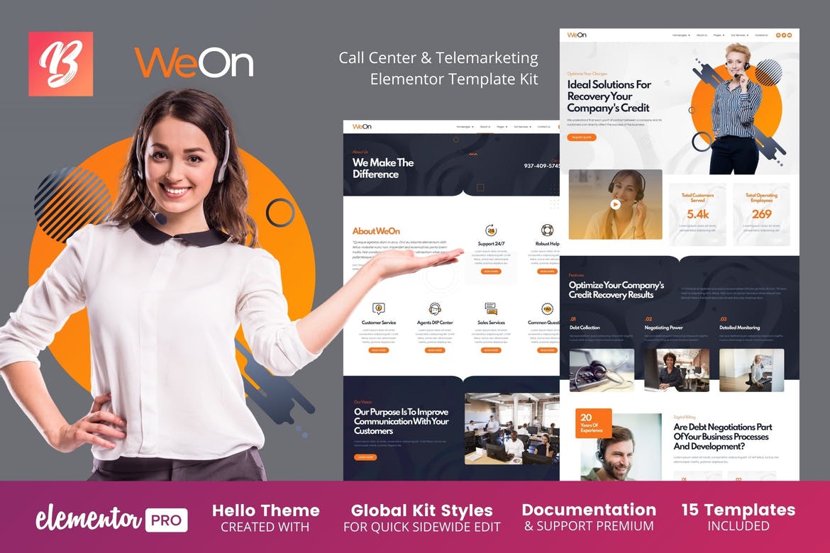 WeOn 是专门为呼叫中心公司、电信、聊天支持等开发的套件。这款现代而清新的套件是您开展业务所需的一切。我们研究了几家公司,并根据不同企业和呼叫中心公司的实际需求构建了此套件。该套件带有许多预定义的内部页面,但您可以使用快速的 Elementor 页面构建器轻松构建自己的页面。